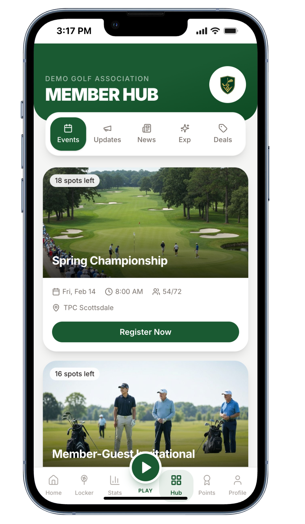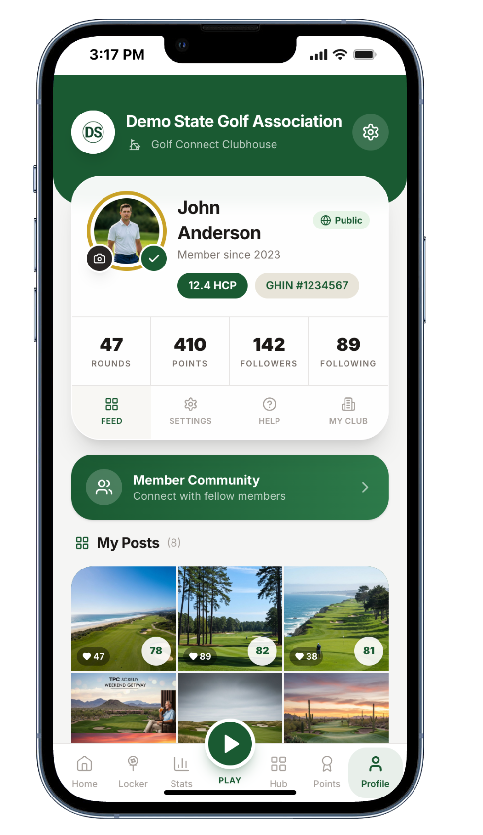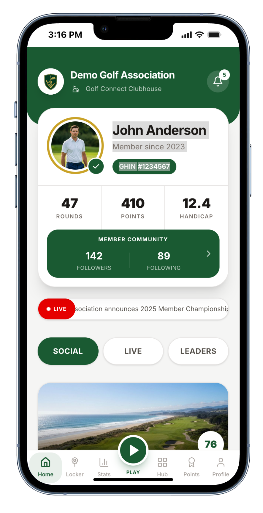 Join your association's digital clubhouse. Track rounds, follow friends, watch live golf, and unlock exclusive member perks.
