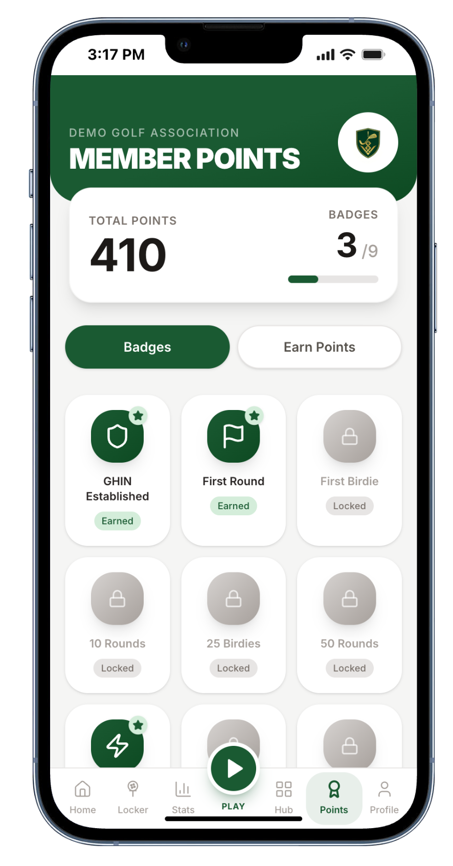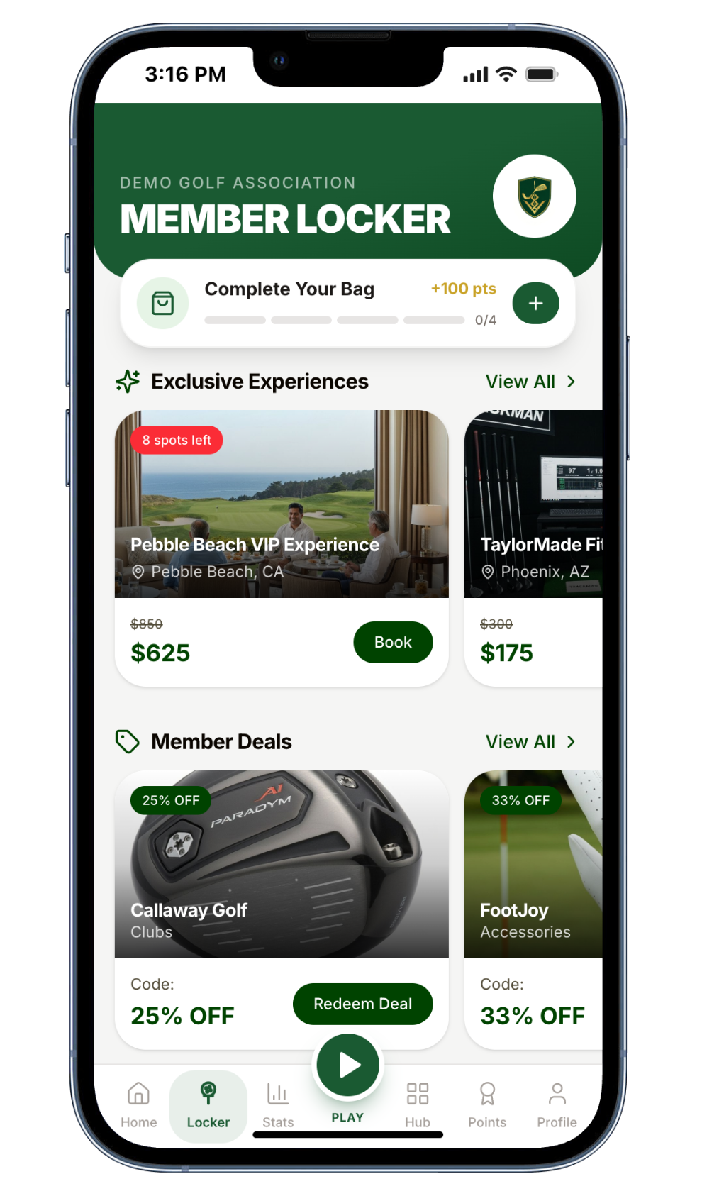 A beautifully designed digital clubhouse where members track rounds, earn achievements, join events, and access exclusive deals.